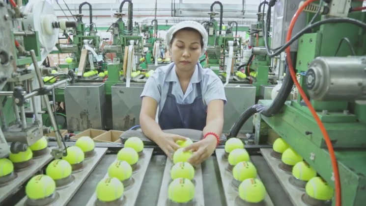 Benedict Redgrove fotograaf opgenomen op een video van de constructie van de verschillende fasen van een tennisbal. De fabriek bevindt zich in Thailand en tennisballen voor de Wilson company produceert.