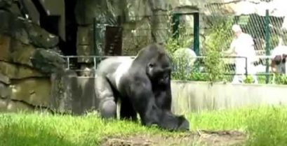 Een gorilla kwalijk en reageert tegen de lastige werknemers in Berlijn Zoo