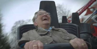 Ria Van den Brand, een 78-jarige grootmoeder uit Nederland, voor de eerste maakt keer een ritje op de achtbaan.
