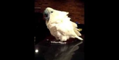 Zeer grappige scène met een papegaai te parapata en valt uit een tabel.