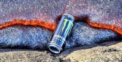 Een blikje monster wordt verslonden door lava