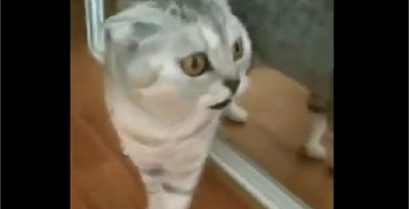 Een kat is geschokt als ze zichzelf in de spiegel ziet. De reactie wordt nog meer grappen in combinatie met sommige geluidseffecten.