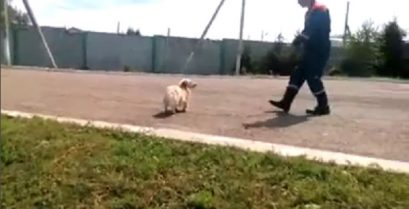 Een hond zet zijn staart telkens iemand hem naderen. De wetenschap houdt handen omhoog.