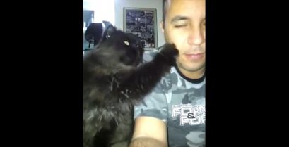 Een zwarte kat Perzië, heeft een speciale manier om de eigenaar van meer snoezige vraagt.
