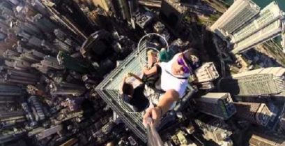 Drie Chinese studenten klom naar de top van de wolkenkrabber Center (hoogte 346 m.) in Hong Kong te trekken deze indrukwekkende video.