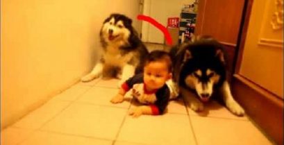 Zeer grappige scène waar twee honden baby malamoyt aanhangers fokken in probeert te mpoysoylisei.