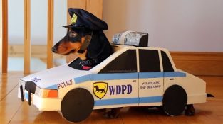 Twee honden spelen ntaschaoynt dief en politieman met hun nieuwe kostuums.