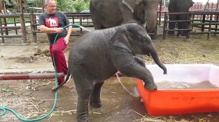 Olifant heiligdom in Thailand Ayutthaya Elephantstay, een onhandige kleine olifant probeert te nemen een bad in een grote plastic kom. Sommige moeilijkheden Voer het bekken, maar vooral in het uitstappen [...]