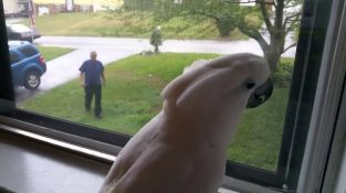 De permanente papegaai opgewonden raakt als hij ziet dat zijn eigenaar terugkeert naar het werk. Kan voorspellen de tijd komt thuis, zitten en wachten in de voorkant van het raam.