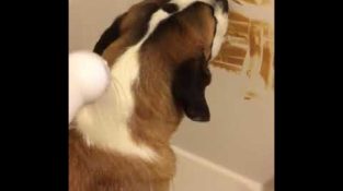 Een truc om zijn hond een bad te geven. Besmeren met pindakaas