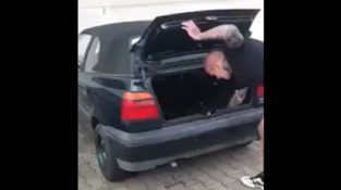 Een man in Rusland gooit een vrij krachtige gewoon in de kofferbak van een auto. De explosie is indrukwekkend.