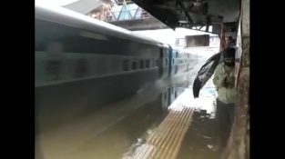 Na de recente overstromingen in India, een trein passeert een overstroomd station, bevochtiging van alle deelnemers.