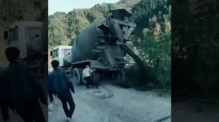 In een straat in China, een mixer vermijdt kort worden ingegrepen in een weg greppel. Gelukkig was Superman er om te helpen…