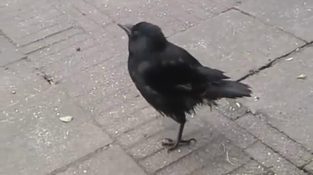 Een gewonde kraai gered door de eigenaren van een boerderij, en na een paar dagen begon het gekakel van kippen die met hem te leven na te bootsen.