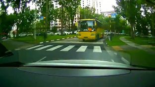 In een straat van Singapore, een bus remde sterk en de voorruit vrijstaande.