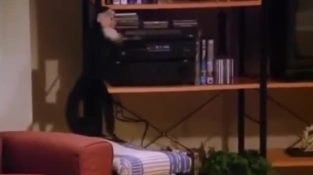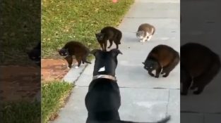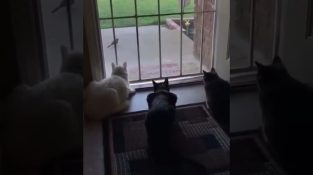 Drie katten kijken met grote nieuwsgierigheid naar een vogel achter een voordeur, wanneer iemand plotseling achter hen komt om hen bang te maken.