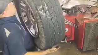 Man zonder benen die auto- en vrachtwagenbanden verwisselt.
