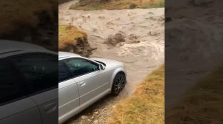 Een jonge chauffeur in Roemenië probeert met zijn auto een bergstroom over te steken.