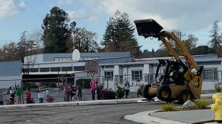 Omdat hij buiten een basisschool werkt, de machinist van een minigraafmachine doet wat trucjes met zijn voertuig om kleine kinderen te vermaken.