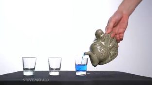 Een theepot met drie verschillende appartementen, waar men drie verschillende vloeistoffen kan bewaren en ze kan serveren door de corresponderende gaten met de vinger te bedekken.