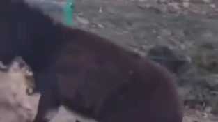 Een wild zwijn steekt een weg over en breekt gemakkelijk de metalen poort van een woonhuis.