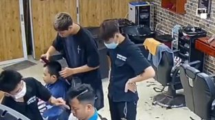 Terwijl een kleine jongen haar knipt, een kapper zal niet beseffen dat de bestuurder van zijn tondeuse weg is. Dit zal het haar van de kleine jongen knippen op de kortste ladder van de machine.