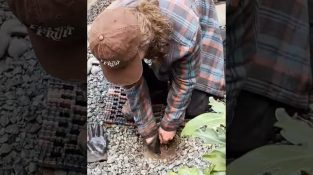 Een man zit in de afvoer in zijn tuin, het uitzetten van een enorme massa wortels.