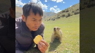 Een bosmarmot benadert een man om een koekje te halen.