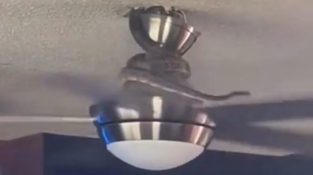 Een slang komt uit een gat in het plafond van een huis, en kruipt naar een plafondventilator. Als het draait, de ventilator gooit de slang rechtstreeks naar de persoon die de video opneemt.