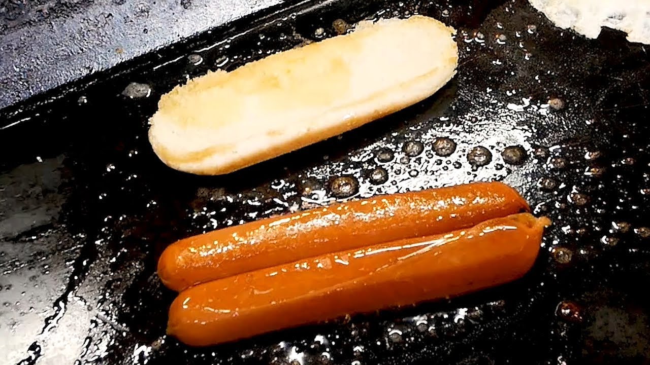 Ansatt i en kantine i Korea forbereder en Hot dog. Fikk du sulten;