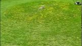 En albatross lander noe uberegnelig i New Zealands Taiaroa Head naturreservat. Fuglen ender med å falle med hodet på gresset, og føttene i luften.