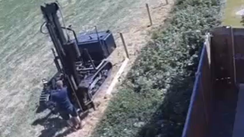 En mann installerer et gjerde ved hjelp av en stakemaskin. Men han hadde ikke studert konstruksjonen ordentlig, og punkterer et gassrør.