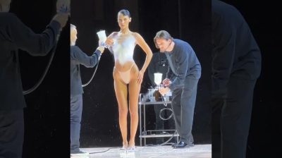 Fredag 30. september 2022 på Paris Fashion Week, Designerne Sébastien Meyer og Arnaud Vaillant lager en kjole som sprayes på kroppen til modellen Bella Hadid.