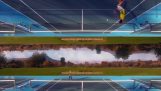 I Polen, en kvinne og hunden hennes følger en gangvei i tre for å klatre opp i himmelen... Dette er en optisk illusjon på en brygge og refleksjonene av den overskyede himmelen på overflaten av innsjøen.