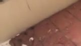 En jente pours tørrfor uten å stoppe i bollen av hennes katt som ikke forstår hva som skjer.