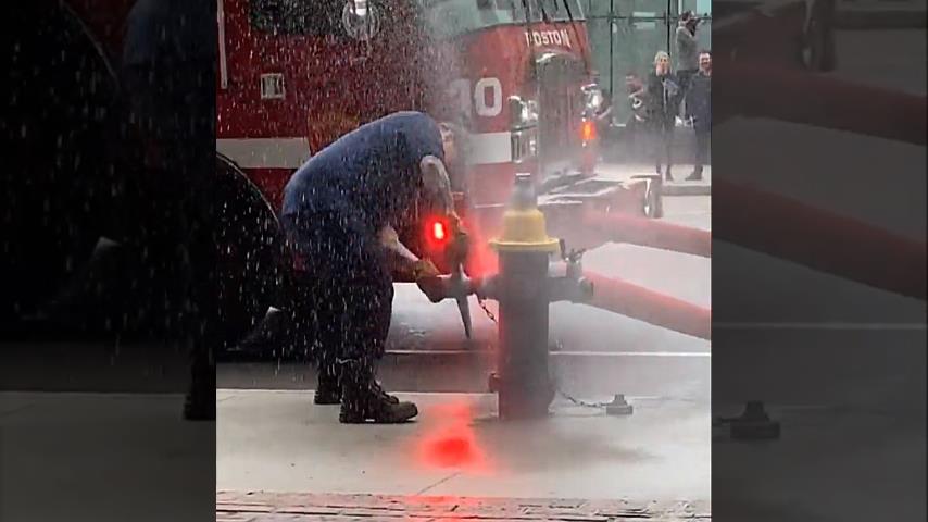 En brannmann prøver å stramme strømningsventilen på en brannhydrant, men det går i stykker og det store trykket fra vannet fører ham bort.