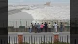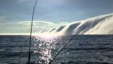 Redningsmannen med en jetski hjelper en surfer flukt fra en enorm bølge.