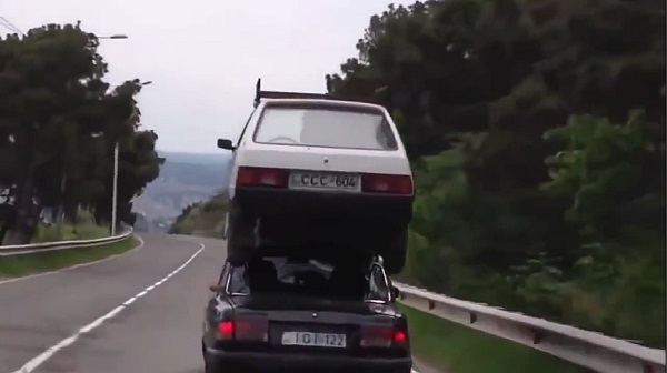 I Russland, en bil passerer en annen bil på taket av. En ny form for kran;