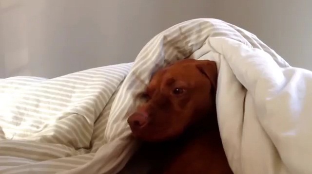 Oskar, en hund rasen ungarske Braque, uttrykker sin misnøye når irriterende vekkerklokken avbryter søvne.