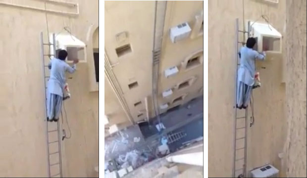 I India, en arbeidstaker bruker en stor stige til å reparere ventilasjon av en bygning. Stigen hviler fra et tau, fastspent på taket av bygningen.