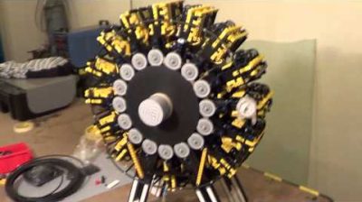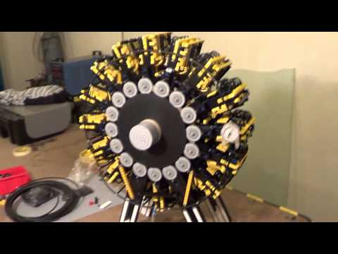 Testmotor bygget for #SuperAwesomeMicroProject som viser en 64 sylindret radial legomotor som kjører på full gass. Vi lagde 3 til og grupperte dem og dannet den 256 sylindrede behemothen som driver eller lego-hot-rod i naturlig størrelse.