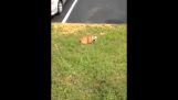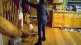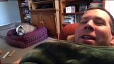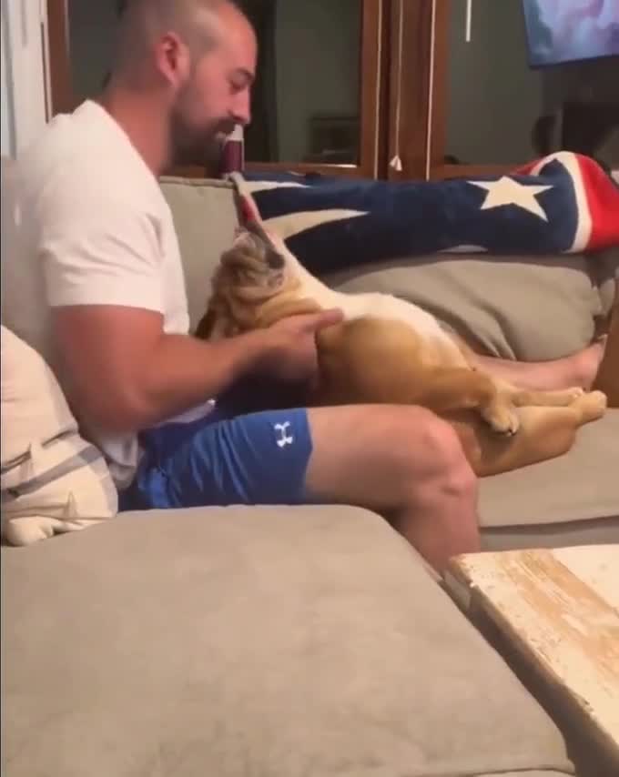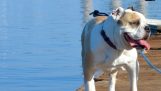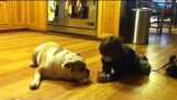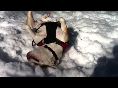 Vår engelsk Bulldog kjærlighet velte seg i snøen.