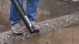 En mann vil bruke en blåser, å krysse en oversvømt vei uten å bli våt.