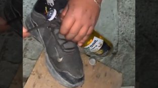 En alternativ måte å åpne ølet på, ved hjelp av blonder på en sko.