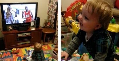 En salgsfremmende basketballspiller Dikembe Mutombo gjøre denne baby ler hodet i latter.