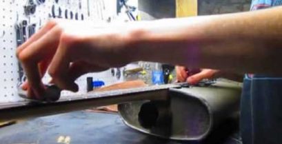 Håndverker gjør en gammel eksos lyddemper, gjør dette en opprinnelige elektrisk gitar.