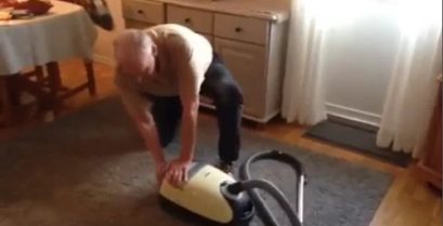 En eldre i Norge prøver å sette foran en støvsuger.