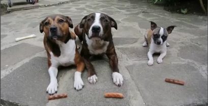Tre hunder venter en kommando fra sjefen å spise deres pølser. En av tre, men er for grådige.