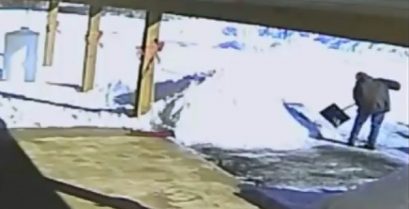 Bestefar slutter med kjedelig rengjøring av snø utenfor inngangen, og går inn i huset til hvile. Beklager...