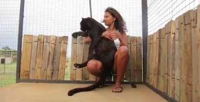 Tzoyi-Argkaoyal, arbeider i feline tilflukt Cheetah erfaring i n. Afrika, spiller med en Black Panther som kjører inn i armene på.